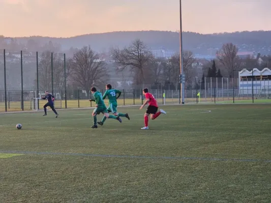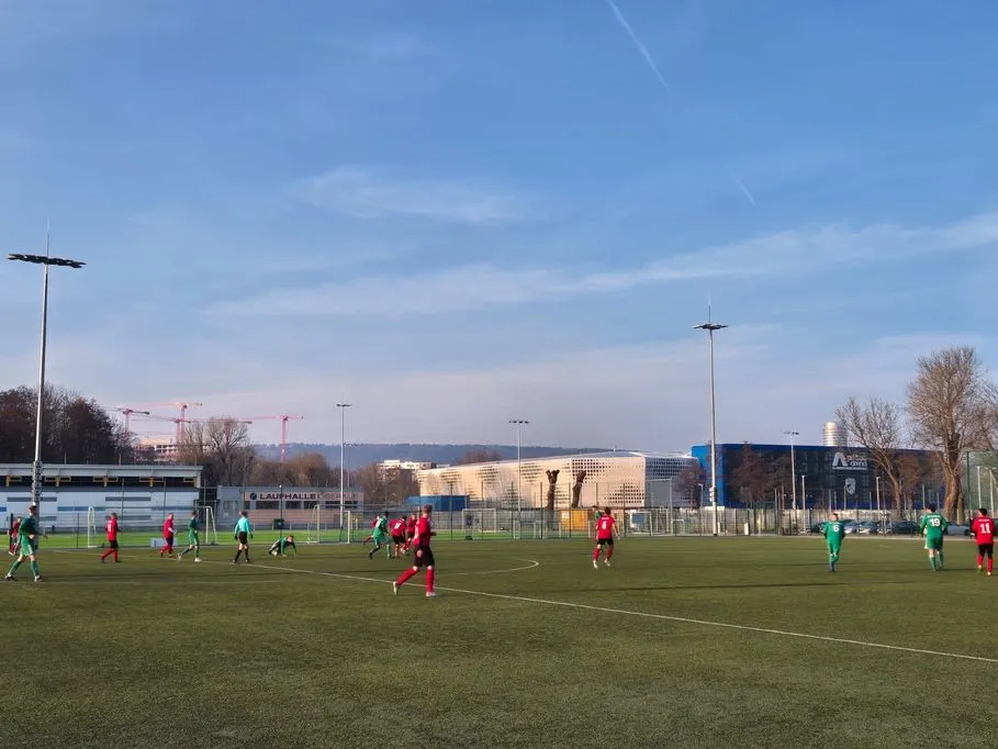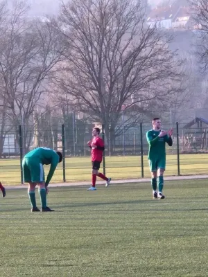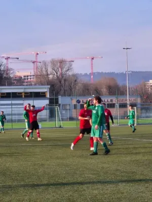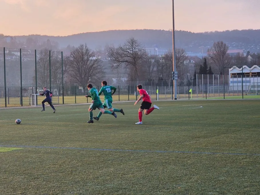 Unsere Equipe trat mit einer Rumpfelf an und wollte so lange wie möglich die Null halten. Dieses Ziel war bereits nach 120 Sekunden Makulatur, als die Gastgeber in Führung gingen. Viele angeschlagene und kranke Spieler fehlten, standen aber auch auf dem Platz, um ihrem Team zu helfen (u.a. Berger, Krüger, Krause). Nach einer guten Viertelstunde kamen Eric Berger & Co. besser ins Spiel und erarbeiteten sich gute Chancen, die zunächst ungenutzt blieben, unter anderem durch Niklas Fritz und Justin Körner. Erst eine unkonventionelle Bogenlampe von Franz Pilhofer brachte den Ausgleich. Jonas Schmitz erhöhte noch vor der Pause auf 1:2, wobei aufgrund des Chancenverhältnisses eine höhere Pausenführung möglich gewesen wäre.