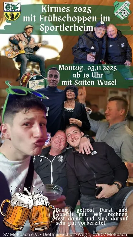 Das absolute Highlight des Jahres steht bevor: Das Kirmeswochenende in Moßbach! Hey, Leute! Seid ihr bereit für das unvergesslichste Kirmeswochenende eures Lebens im wunderschönen Moßbach? Vom 1. bis 3. November feiern wir nicht nur unsere wunderbaren Traditionen, sondern auch das Leben selbst! 🍻
